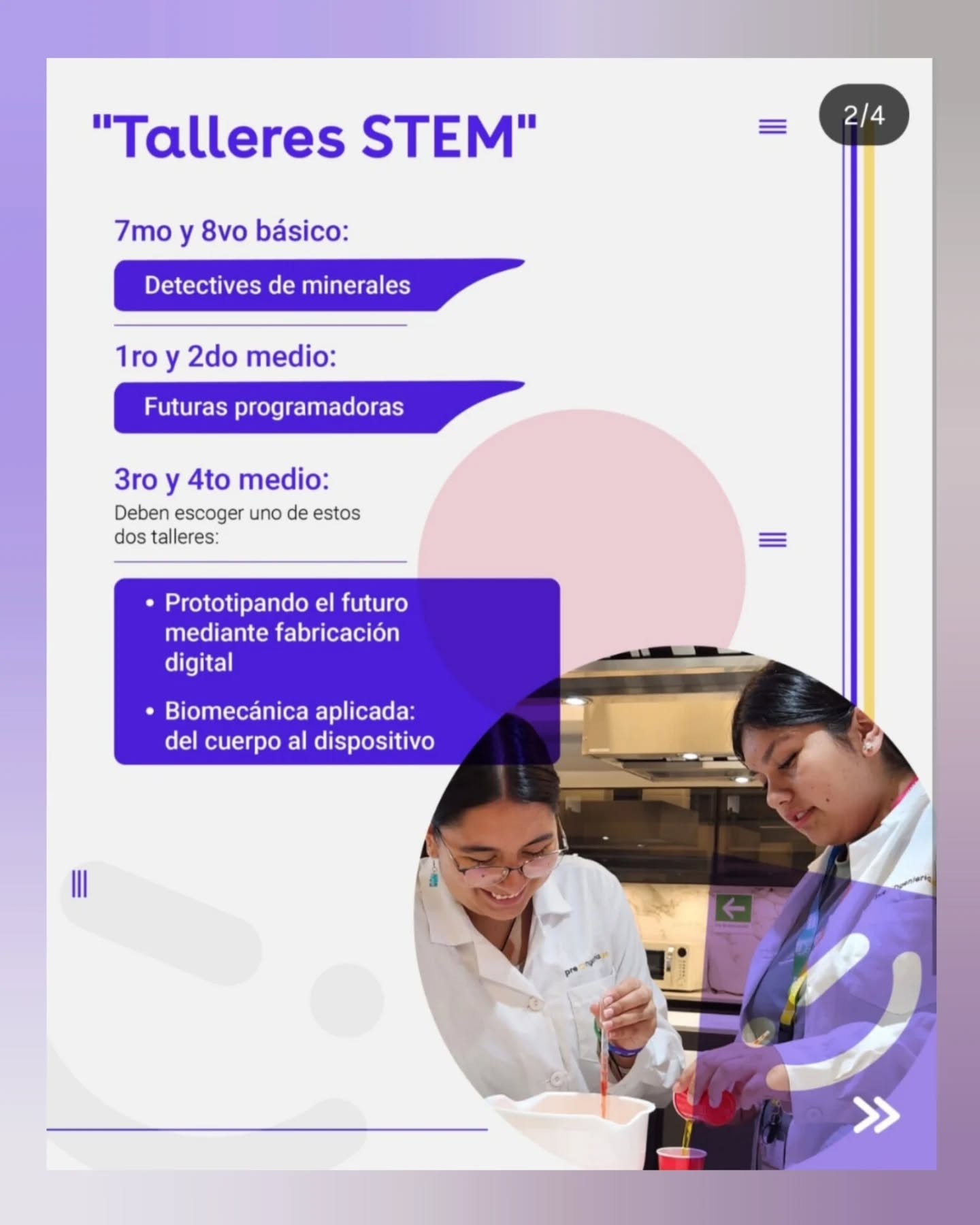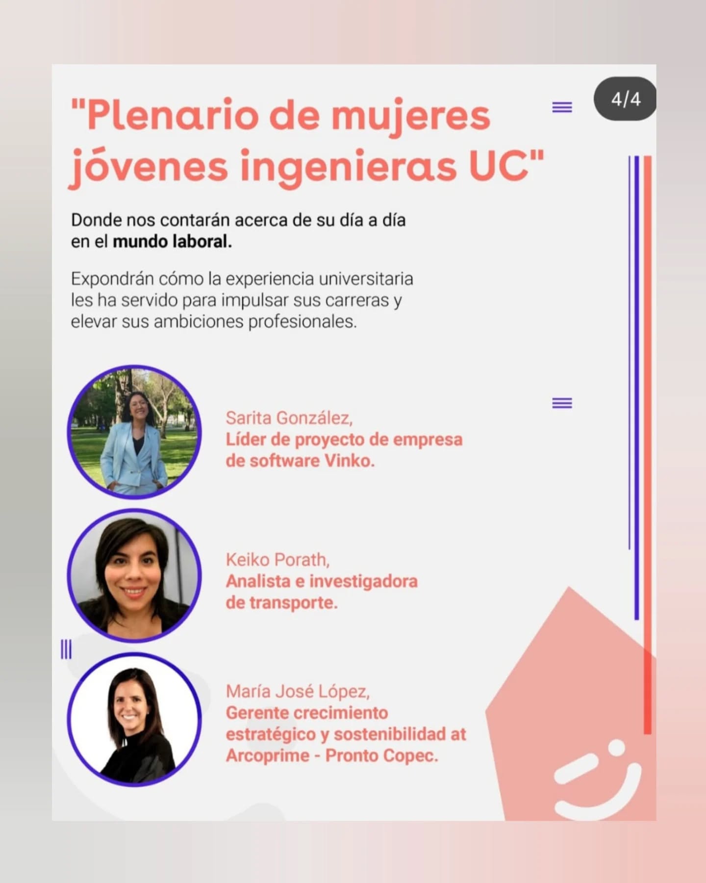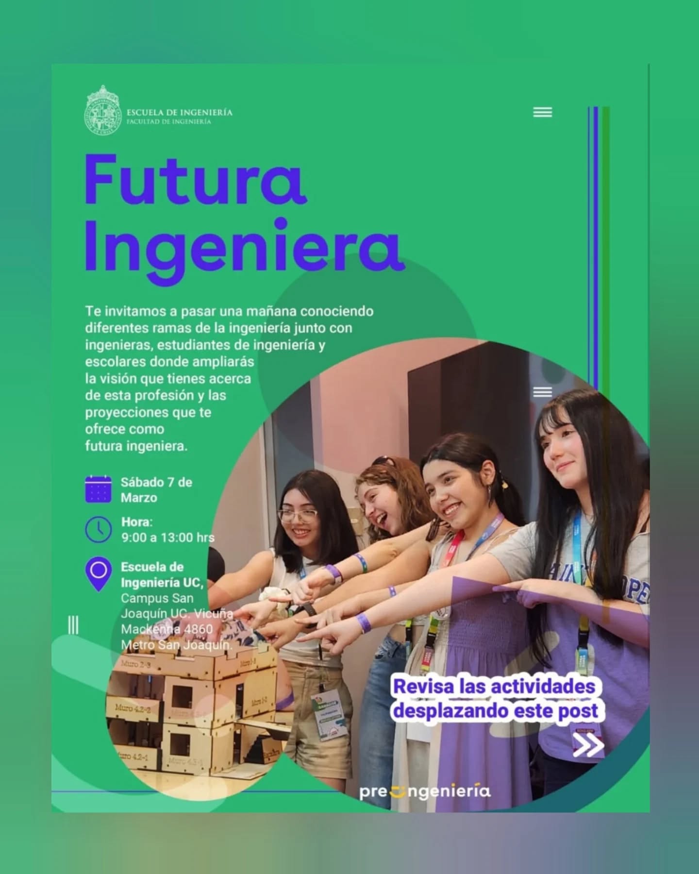 Te invitamos a pasar una mañana conociendo diferentes ramas de la ingeniería junto con otras adolescentes de diferentes colegios. Comenzarás el día en alguno de estos talleres: 🎉 Detectives de minerales, para 7mo y 8vo básico 💻 Futuras programadoras, para 1ro y 2do medio 🧪 Biomecánica Aplicada: del cuerpo al dispositivo, para 3ro y 4to medio 👍 Prototipando el futuro, para 3ro y 4to medio Luego conoceremos el Campus en un tour académico guiado por estudiantes de Ingeniería UC. Y finalmente conoceremos en qué trabajan jóvenes ingenieras y los desafíos que enfrentan en su vida laboral: 💥 Sarita González, Líder de proyecto de empresa de software Vinko. ✨ María José López, Gerente Crecimiento Estratégico y Sostenibilidad at Arcoprime – Pronto Copec. 🚴 Keiko Porath, Analista e investigadora de Transporte. 📍 ¿Dónde? Escuela de Ingeniería UC, Campus San Joaquín UC. Vicuña Mackenna 4860 Metro San Joaquín. 📅 ¿Cuándo? sábado 7 de marzo de 2026 🕒 ¿A qué hora? de 9:00 a 13:00 horas. Actividad disponible para escolares que se identifiquen con el género femenino. 💜 No te pierdas esta oportunidad de compartir con mujeres del área STEM y conmemorar el Mes de la Mujer aprendiendo entre nosotras ¡Te esperamos!